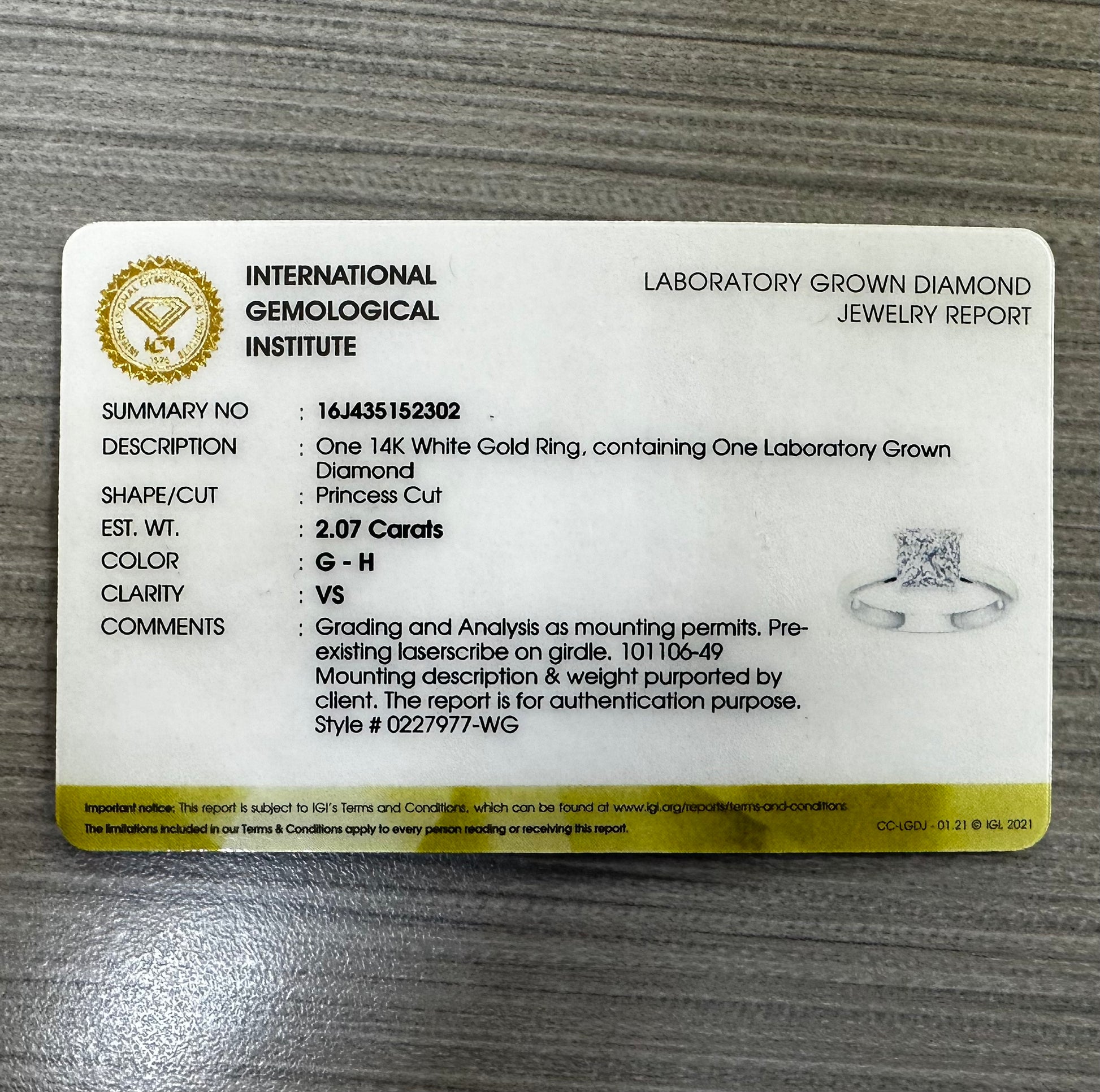 2.07 ct princess lab grown diamond